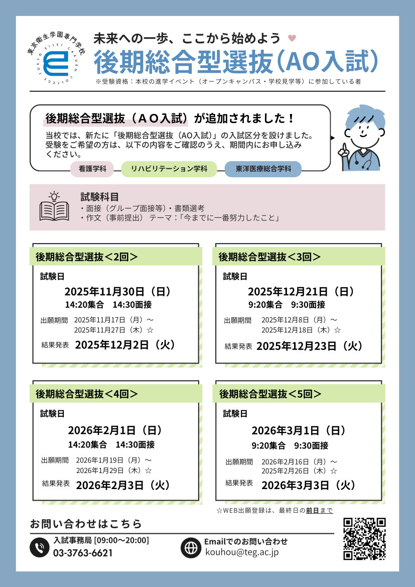 【お知らせ】後期総合型選抜のご案内 公開日:2025-11-14 お知らせ 後期総合型選抜のご案内 2026年度入学者向け、後期総合型選抜(後期AO)のご案内です。 東京衛生学園専門学校では、新たに「後期総合型選抜(後期AO)」の入試区分を設けました。 後期総合型選抜のご案内 チラシ 後期総合型選抜 募集要項 詳細はこちら 関連記事 【お知らせ】新年のご挨拶と共催セミナー等のお知らせ【お知らせ】掌友会ホームページリニューアルのお知らせ【お知らせ】12月の共催セミナー等のお知らせ【お知らせ】第44回 学園祭(衛生祭)開催のご案内【お知らせ】特待生選抜入試のご案内【お知らせ】入学者紹介制度のご案内 投稿ナビゲーション 【お知らせ】新年のご挨拶と共催セミナー等のお知らせ【お知らせ】特待生選抜入試のご案内